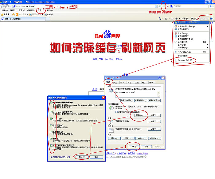 操作如下: IE浏览器 菜单里面的“工具” - Internet选项 -- 常规选项 - 点 删除,选择所有,确定