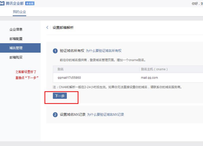 我之前都设置好域名mx解析了,直接下一步
