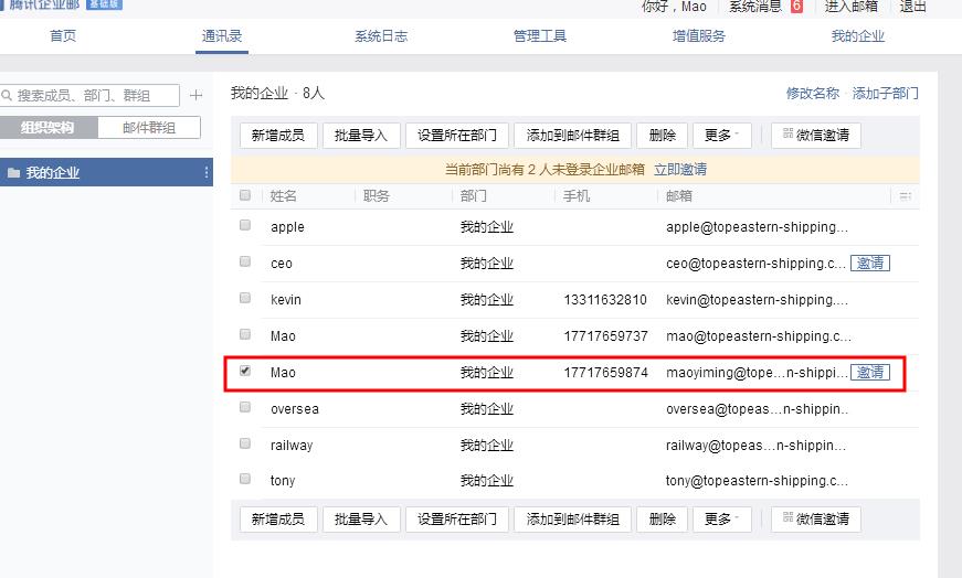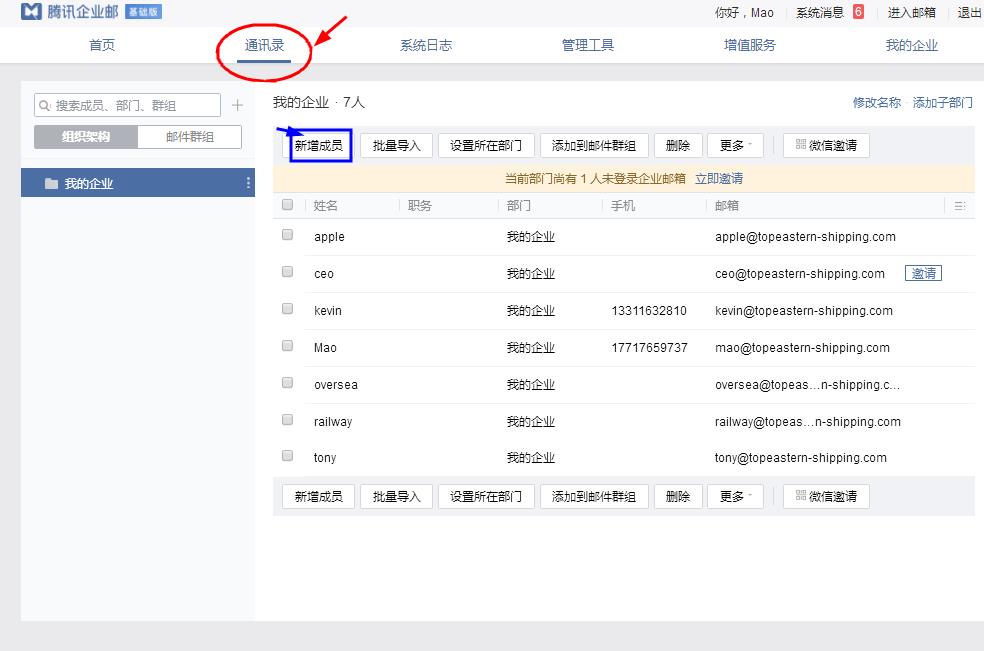 现在,进入邮箱界面了,点通讯录,一个一个的,新增成员